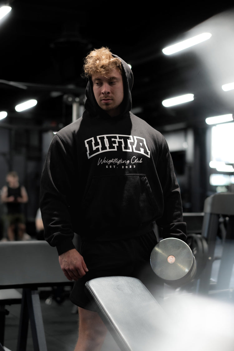 The Club Pullover Hoodie is designed to combine comfort and style. Its soft fleece lining makes it warm and cozy, ideal for chilly mornings or relaxed evenings. The spacious hood comes without drawstrings for a clean, minimalist look. On the front, you’ll find the Lifta Weightlifting Club logo and a roomy kangaroo pocket. This hoodie is perfect for both training and everyday wear.